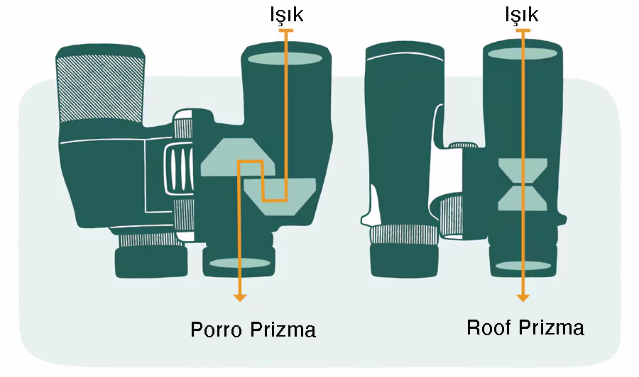 Porro prizma ve çatı prizma dürbünler arasındaki farkı gösteren bir çizim