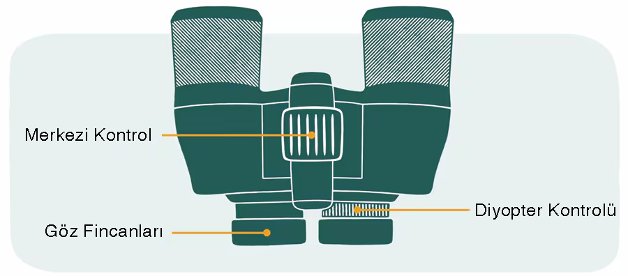 Göz kapağının, merkez kontrolün ve diyoptri kontrolünün nerede olduğunu gösteren bir dürbün çizimi